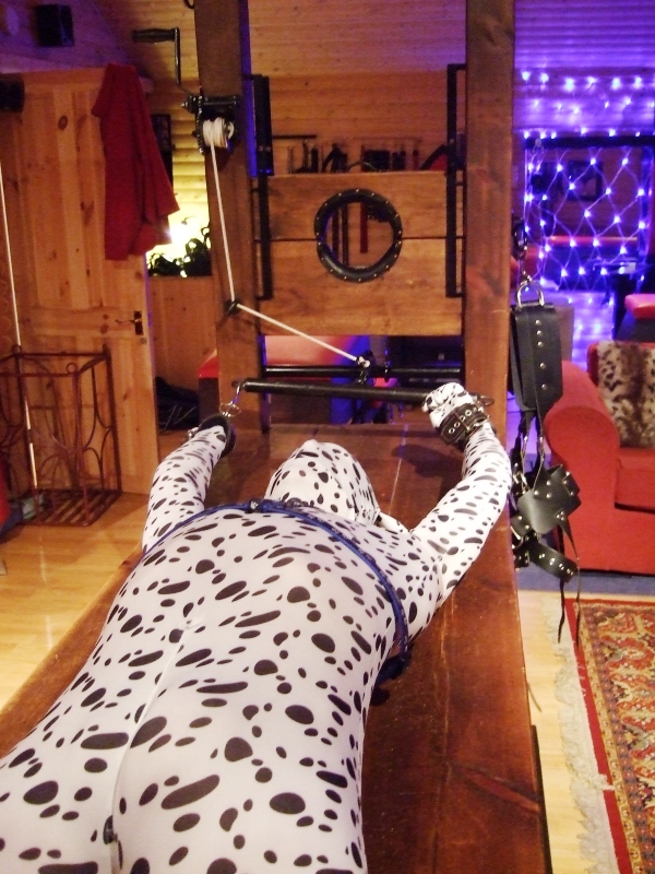 A now fairly tired Spot gets changed into Zentai … harness on (this time the doggy harness), knee pads and paws … I can now relax π Phew!
