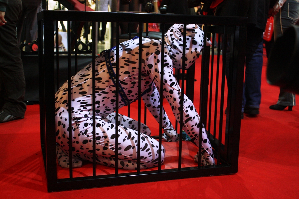Her husband, Darrell, a trained welder, handles that side of the business. Melanie attaches the leather restraints and rotating dildos. An example of creative destruction; though Schumpeter might have struggled to find a place in his theories for “Spot”, a man in a full-body Dalmatian suit who is crouching in a small kennel-size metal jail, made by Darrell. A friend of theirs? “No,” says Darrell. “He first came up to us at the show and asked if he could sit in our cage. I believe he even sleeps in a cage.”