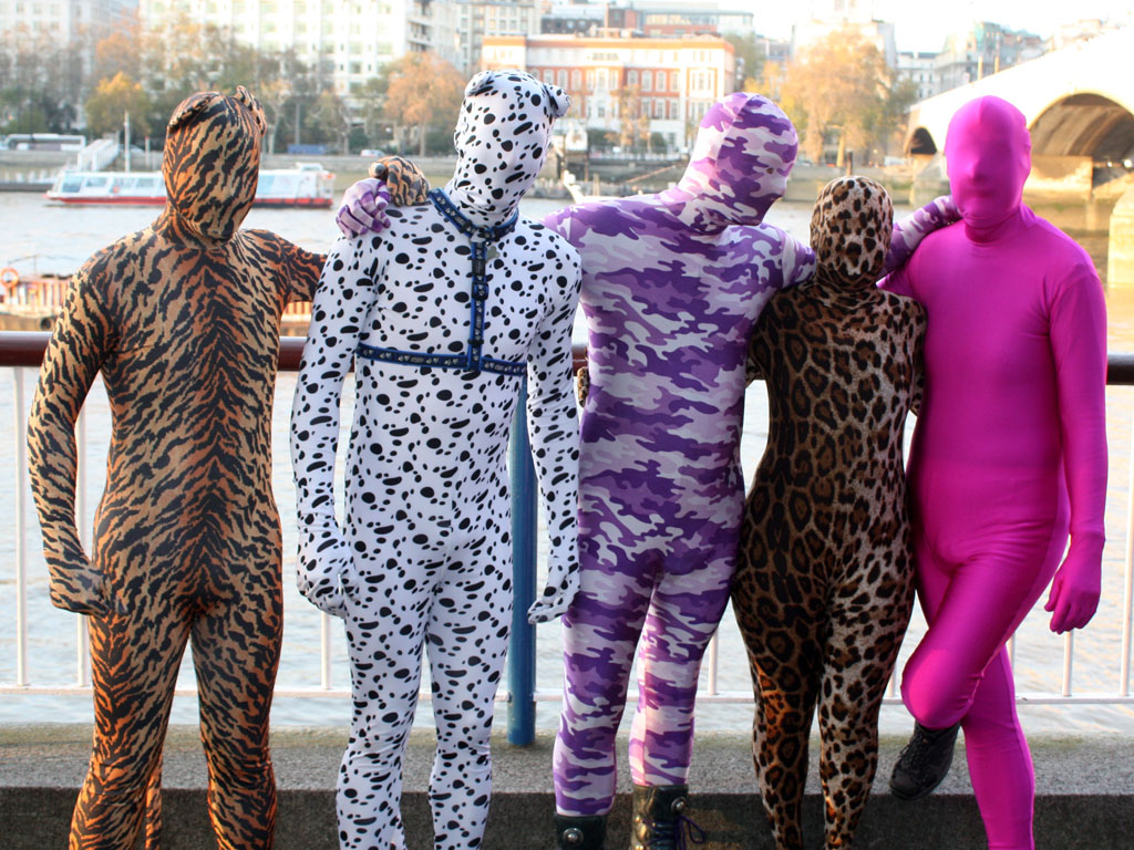 The afternoon started with layering up the lycra – a Yellow Leotard as the base layer, then my Hoodless White Zentai followed by Spot’s normal Dalmatian Zentai. This isn’t what’s normally done – it’s usually just a white thong under the Zentai for public appearances, but due to the absolutely freezing weather, layers were the only option. Colin, the photographer, found it cold in his normal clothes but strangely, it wasn’t actually too bad in the Zentai – probably to do with the even coverage all over…