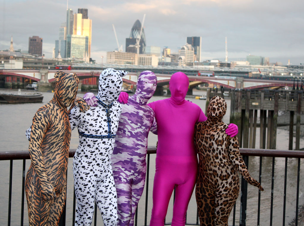 After everyone else had got changed (4 people from the group – the most we’ve had on a zentai walkabout – and Sarah, the editor of the magazine), it was decided that logically, it was best to brave the cold then conduct the interviews, giving us a chance to warm up again! We headed from the Royal Festival Hall along the South Bank heading towards the Tate Modern direction, stopping along the way for the inevitable posed photograph for the magazine, as well as random photographs with members of the public.