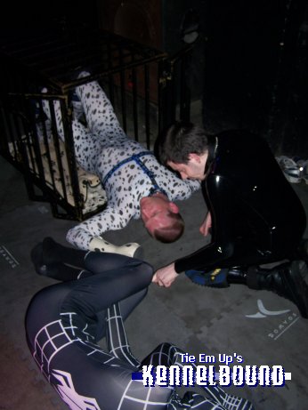 After I’d finished getting dressed, I made my way over to the ‘KennelBound’ area of the club, and my owner brought me over a drink. I spent some time catching up with Scamp at the time, and decided that it was worth putting myself in the cage as my owner had departed to help one of our other friends put on their latex mitts. I curled up in the cage all relaxed 🙂 I had to get out though, when I needed to go to find a tree.