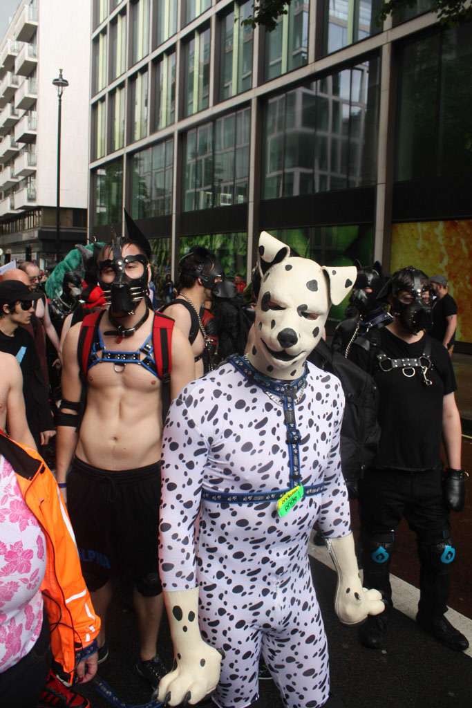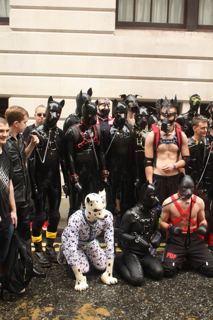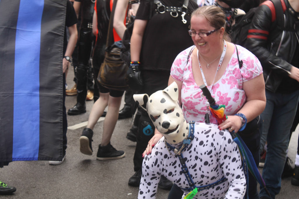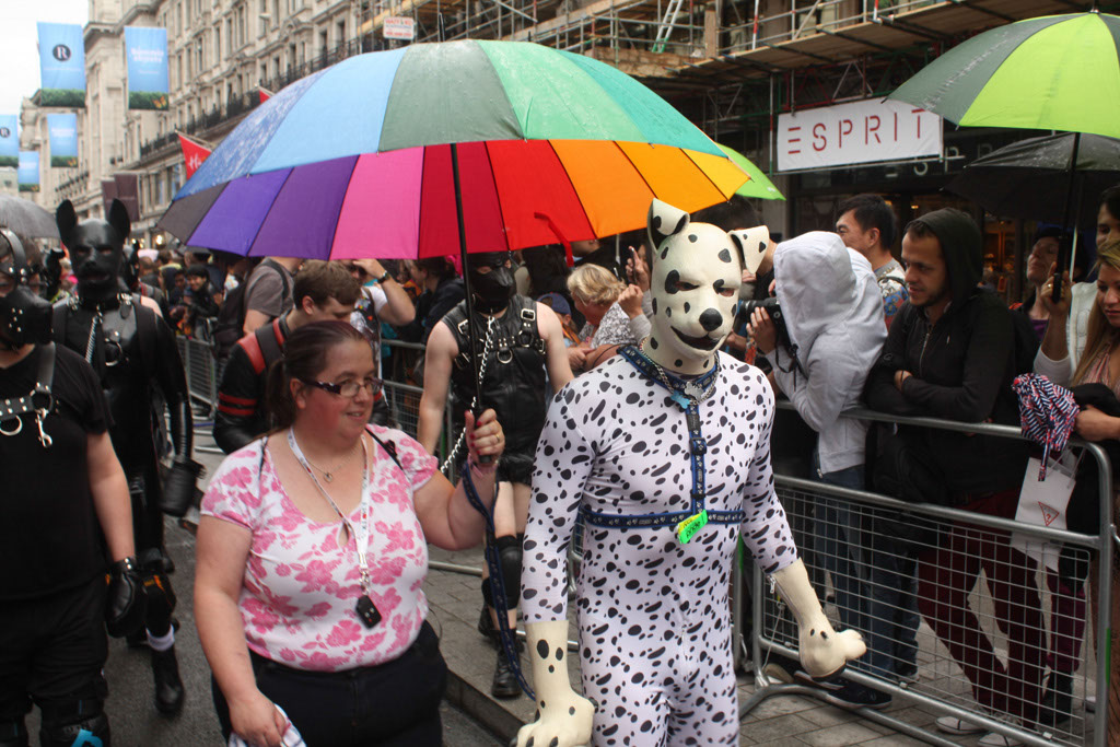 Due to a slight delay at home, we got off a bit later than planned, but still with enough time to get there before the Parade started. En-Route, we met with Caz and Wayne and carried onto Baker Street. … A quick loo stop and snack and then down to meet the rest of the group. Once with the rest of the group [too many names to remember to list here!], I finished off putting the hood, paws and knee pads on, and became my pup self. … Then the rain started!!! Luckily we bought a rainbow brolly and it was big enough to keep this pup and Caz dry. Whilst waiting for the Parade to start I bumped into a few people I knew which was fun π *wags* and we all hoped the rain would pass – which by luck, it did just before we started.