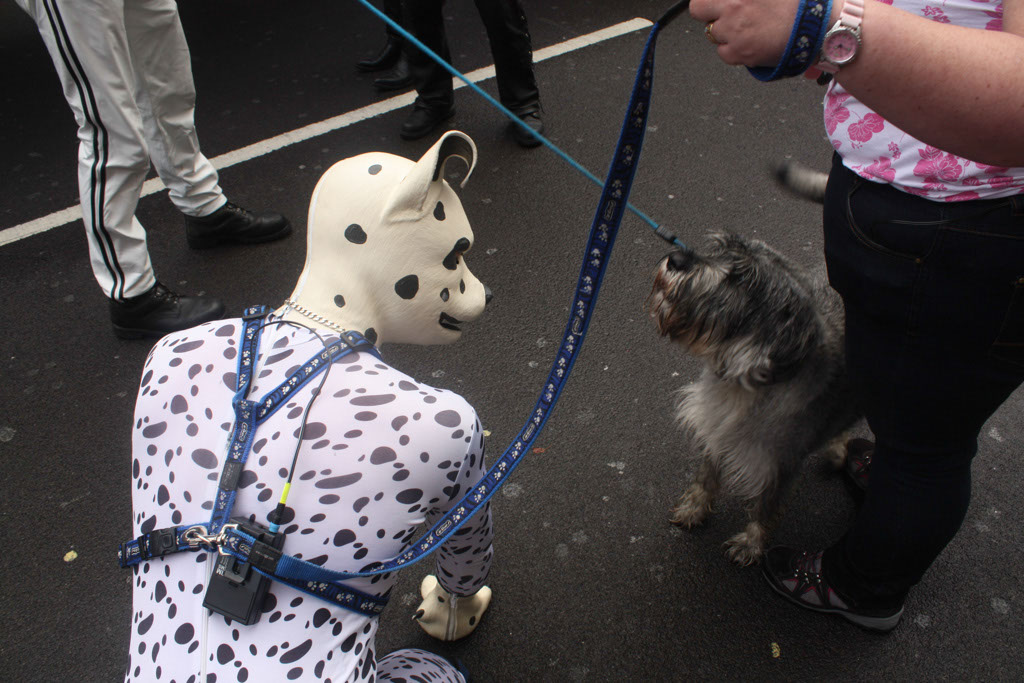 At one point I went and said ‘hello’ to a real bio-puppy, too much amusement from people around. … The parade moved at a steady pace for the main part, so I was stood up, barking – though whenever we stopped I dropped to all-4’s and had fun with the crowds. One person even gave me their real dog so they could have a photo with me and the real dog *wags*