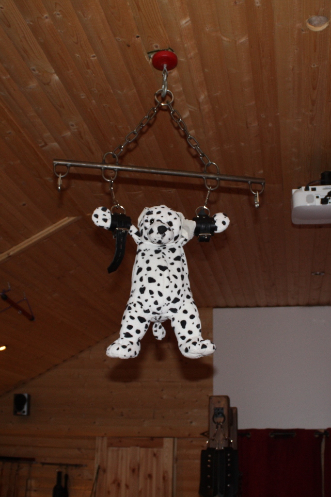 Splodge and Dollop (the 2 stuffed toy Dalmatians) started the fun and were put straight into the head stock (pic went onto Twitter) and I put on the newly purchased foot suspension cuffs … winches down and we gave them a quick trial run … very pleased … but the rest was to come later.