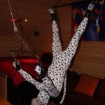 Again a quick break, and discussion as to what to do next … The dungeon has a suspension leather cage which, once we had worked out the way round and untangled it, there was a Spot now encased in a lattice of leather suspended from the winch, and every movement pulled the lattice work up tighter … MORE torment and teasing! When I was finally let down, there was good evidence of the leather straps!