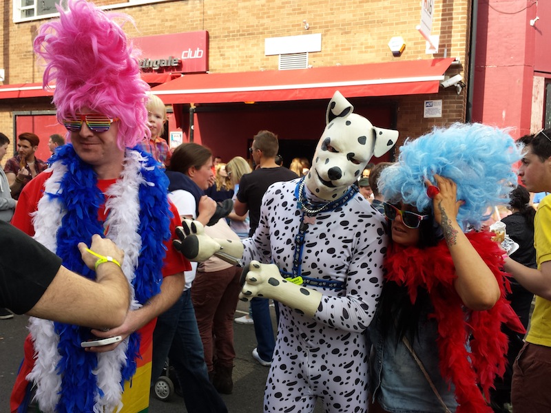 This is where the fun begun – wearing figure hugging Lycra, there wasn’t really much place for me to hide anything. The comment from the security guard was along the lines of “I need to be sure that you haven’t anything to hide”, as I’d made the comment that I had no pockets to hide anything … I let him pat me down to be sure … he then announced to his colleagues, that I had nothing on me I shouldn’t and then proceeded to point at my middle area and went on to say “… well, apart from maybe that!” … he was referring to my manhood …. while another security guard exclaimed on the fact that there was a dog in the bag as well – referring to my pup hood and paws! We all chuckled and then were allowed in to the Pride village