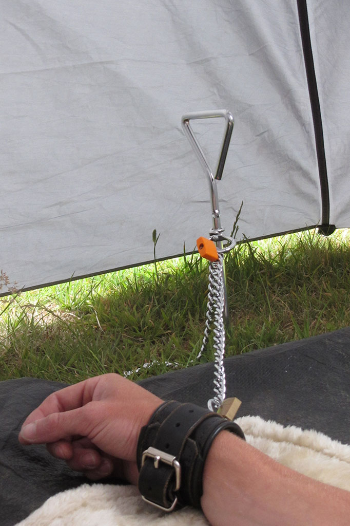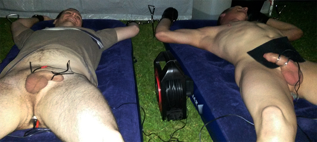 The challenge was defined such that both Forester and I would be tied down and connected up to E-Stim Systems 2B with the same attachments and electrodes, with the challenge being to last 45 minutes without cuming while others tried to make us cum by tweaking the control boxes. We ended up staked out on the floor in our ‘social’ marquee (well, we were on air beds), while we started the challenge. However, mid-way though the time we decided to change it so that each person could have their own favourite setup – Forester prefers continuous, while I’m not a fan of that… he also prefers rubber straps which I don’t get on with.