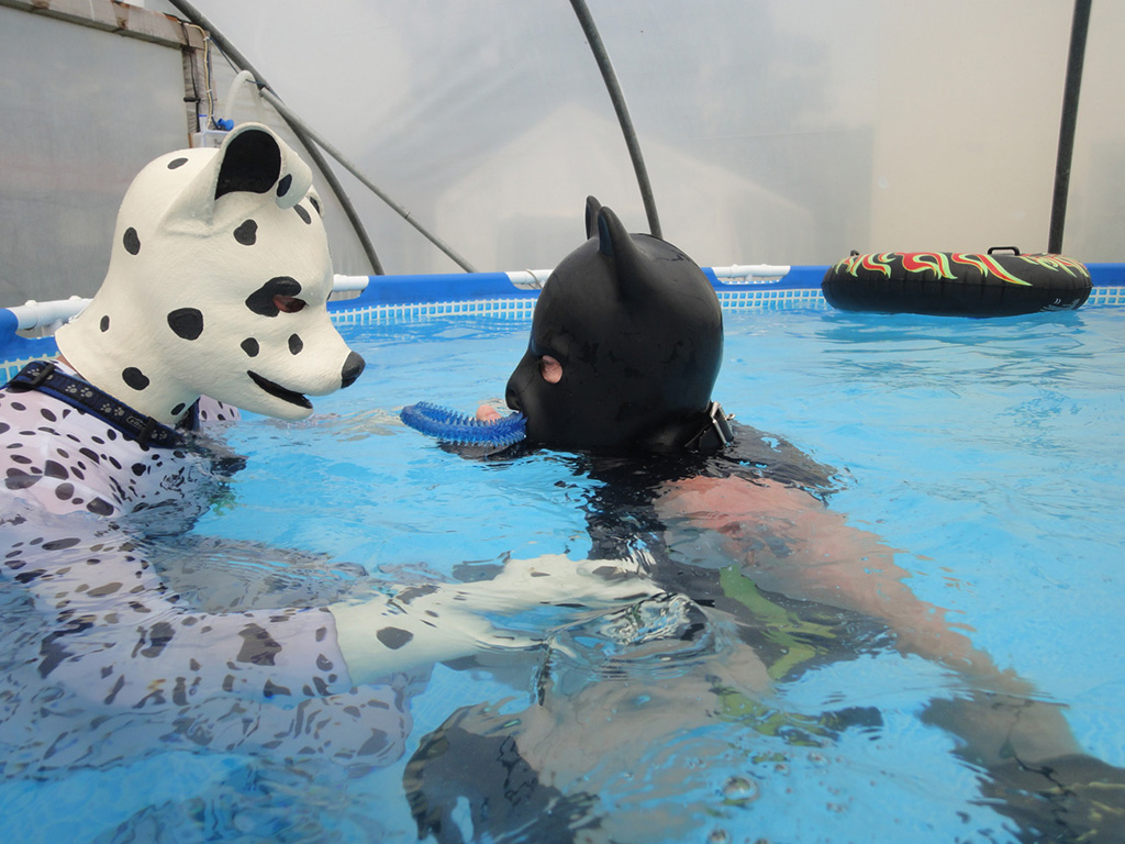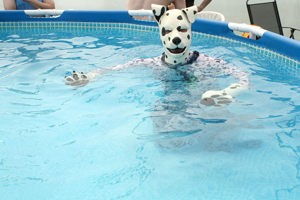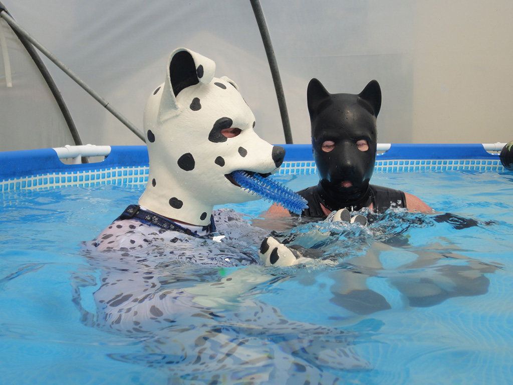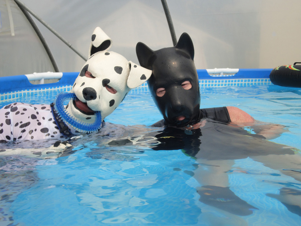As we set off across the camp site to the pool, I was walking on all fours like a puppy, and we were getting attention from the other campers on site – and my poodle friend from last year started barking at us as well. We completed the short walk to the pool, to find there were people already using it, so we had to be respectful to them. I think they were a little unsure of what to make of it, as Marbles and I ascended the step ladder and climbed in. It turns out, I discovered, that wearing my full suit and latex paws, that you are just about able to do the doggy paddle and also to swim under water! As fun as it was, we weren’t able to spend much more than about 10 minutes in the pool as there were other people and also we had the afternoon’s activities to prepare for. We climbed out, and Michael expertly led us back to the camp (me now in wet white lycra π ) so we could get ready for later on, again on all fours.