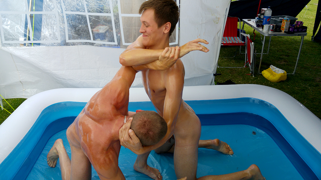 Towards the late afternoon, Forester and I ended up back in a swimming pool, awaiting the results of the Head 2 Head vote which had been running for a few weeks across a couple of websites. The only thing we had been told in advance was that the people voting had voted for both of us to be gunged naked (although I kept the cock ring I had on for most of the weekend on).