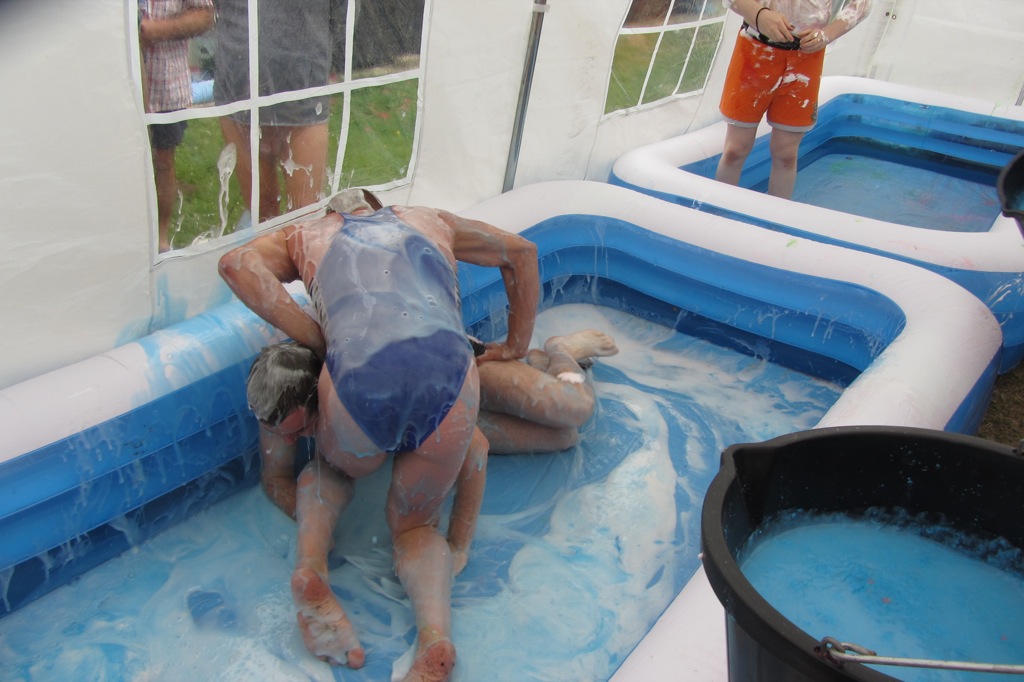 Lunch was served, and then everyone got changed in to what they were wearing for the messy activities. I debated between 3 outfits for the wrestling (if you’re going to do it – do it properly *wags*) and eventually settled on a blue leotard. We sorted out towels, cameras etc. and headed down to the area where the mess was happening.