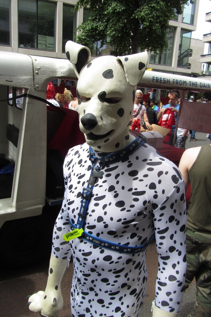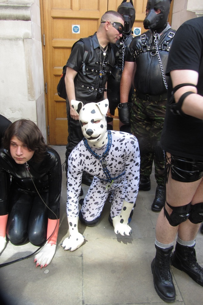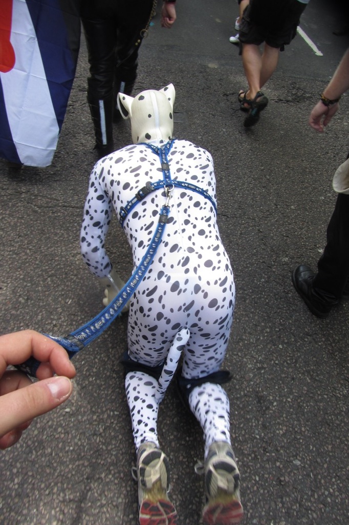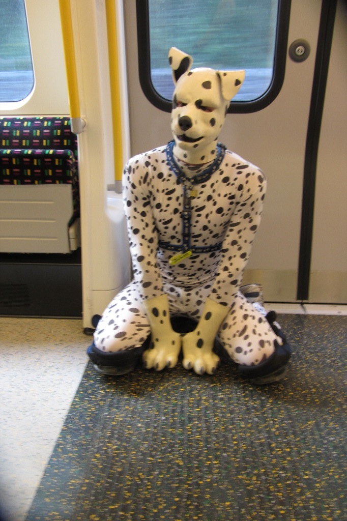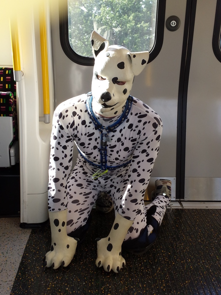 We decided to take the Underground from Oxford Circus to Kings Cross, but my owner wouldn’t carry me on the escalator, even though I was still in full Pup gear – Hood, Paws, Knee Pads, Harness and Zentai! π *whimpers*. Though, when we arrived at Kings Cross, I just had to do a daft thing … so on the escalator, I dropped to all-4’s and went up to Kings Cross, my head just above the handrail, so people could see a Dalmatian Puppy π *wags*. At Kings Cross we headed to Baker Street, where on arrival, a bottle of drink was purchased, and we got onto the Met Train towards Uxbridge … well, the train had very few empty seats, and I couldn’t resist – I sat on the floor, as a puppy for the entire journey – It caused much merriment to those on the tube, some suddenly realising that I’m not a dog, but someone dressed as a dog, and others trying to discreetly take pictures – I’ll say this here: I don’t mind pictures being taken of me π *wags* – If you’re not sure, do ask – I don’t bite and as yet I’ve not said ‘no’