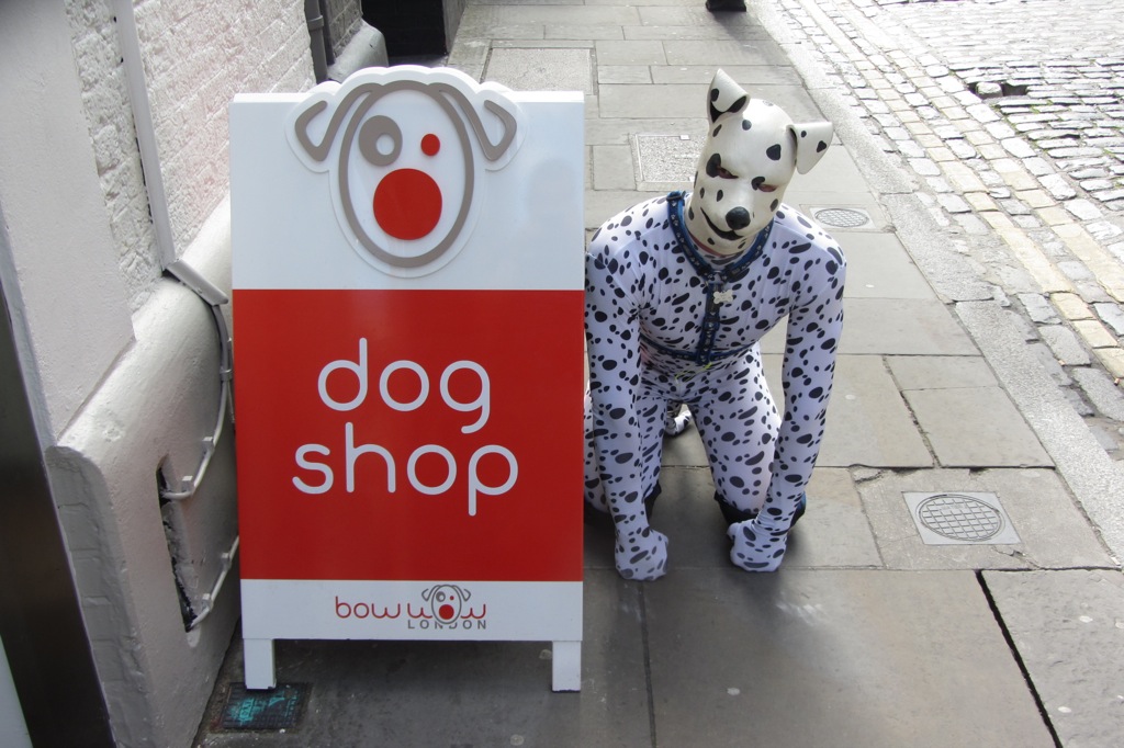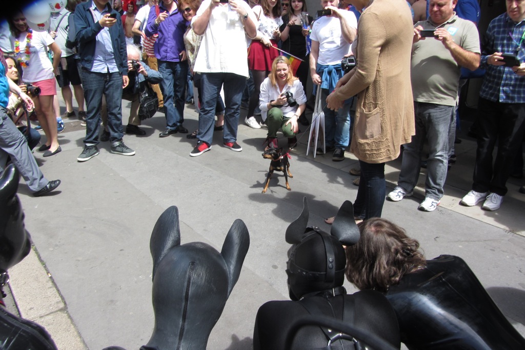 After food, we carried on into Soho – but not before spotting a “Dog Shop” – well, you don’t miss the opportunity whilst out with all the hood and paws etc … so I put the RubberDawg hood back on, dropped to all-4’s and my Owner took a picture of me beside their shop ‘A’ Board … From this point on I kept the hood on again … Off into Soho, absolutely crowded with people all having a good time. It took a while to get to Prowler – not just because of the number of people there, but because so many people wanted to have their picture taken with me!