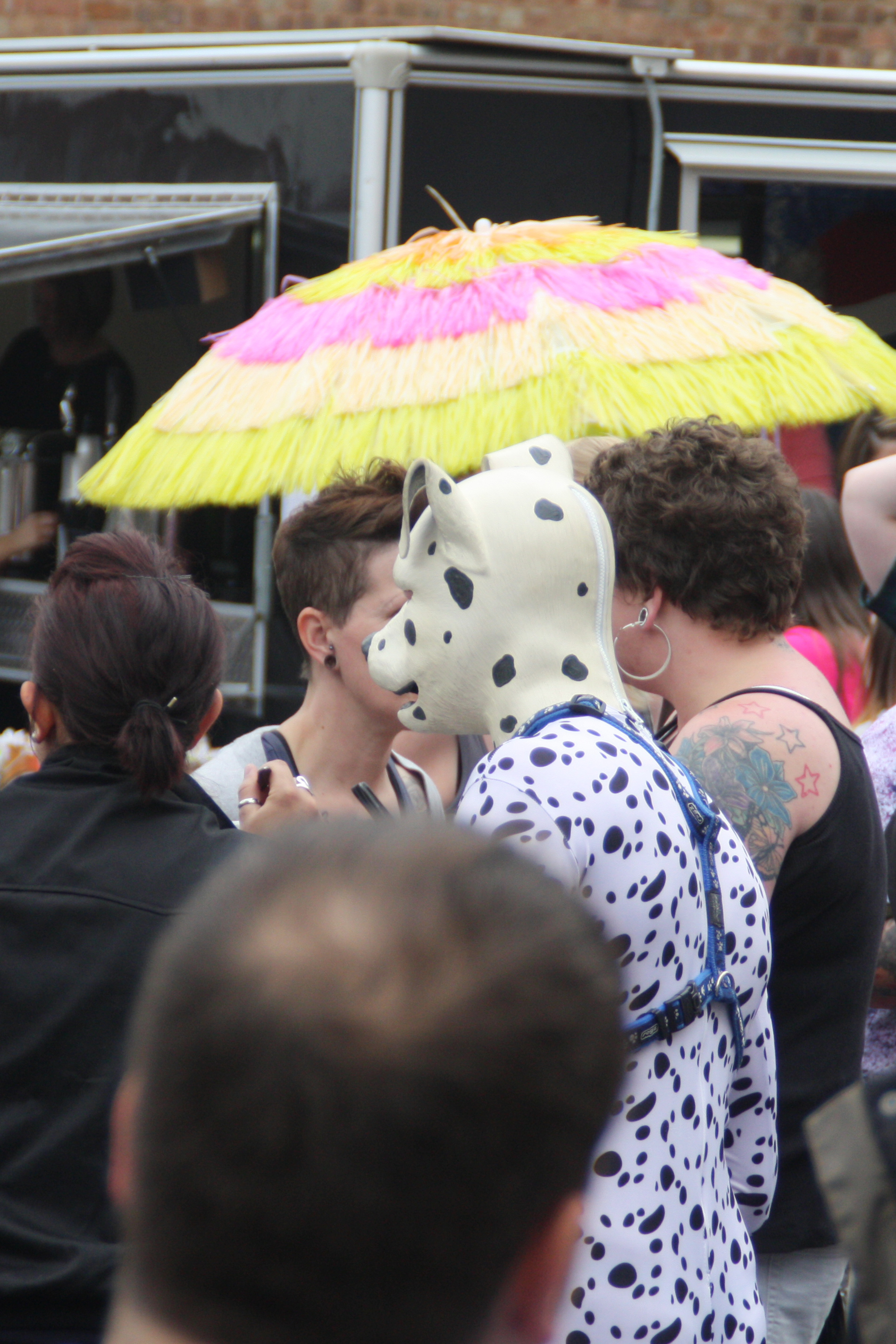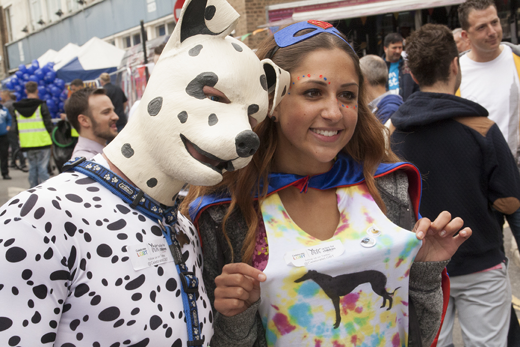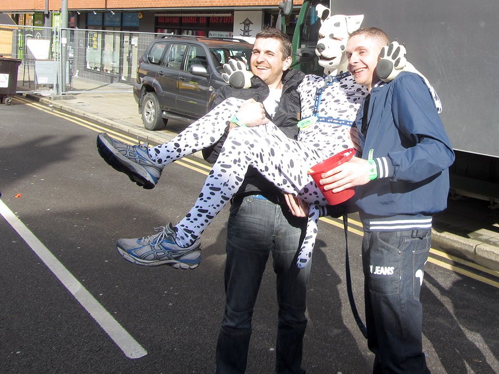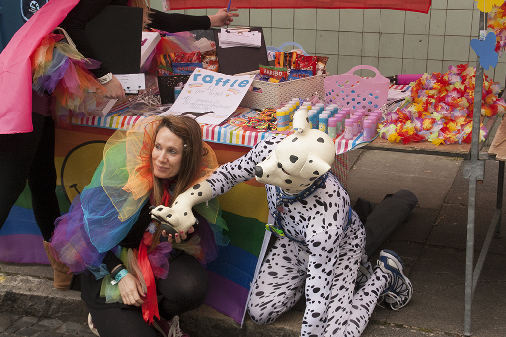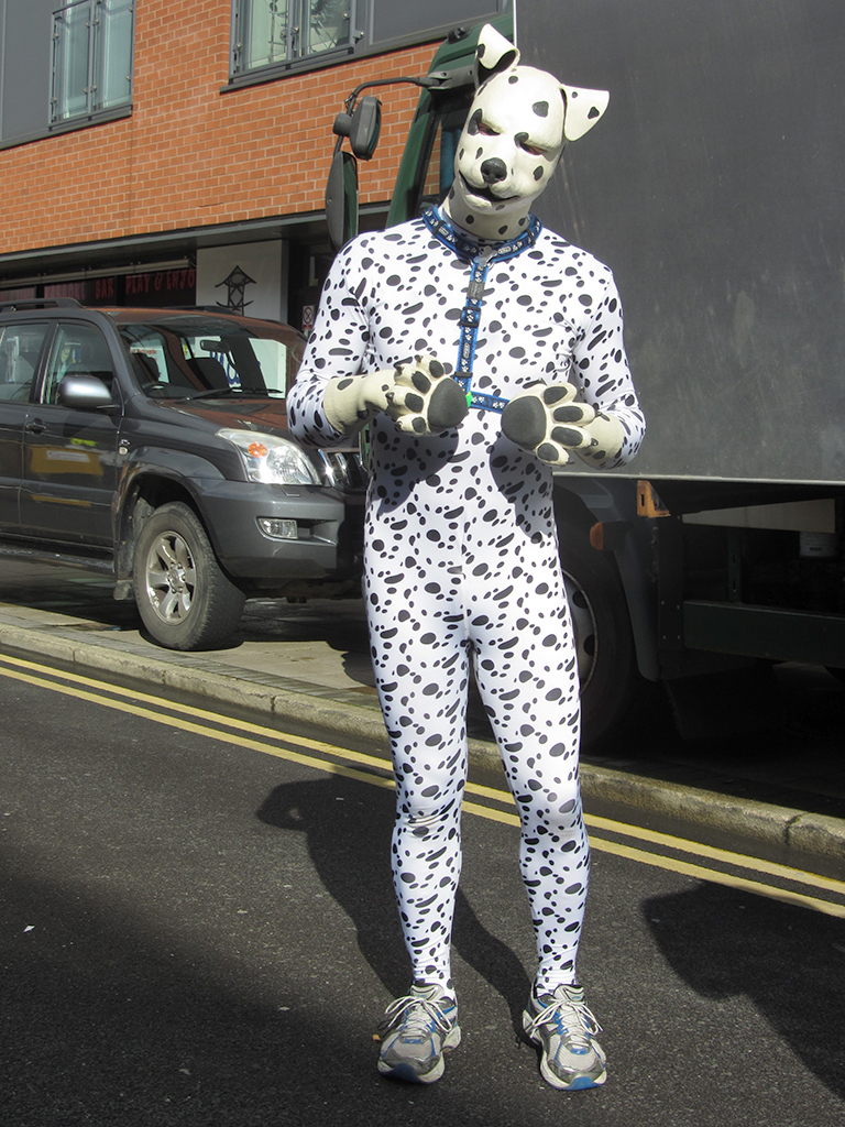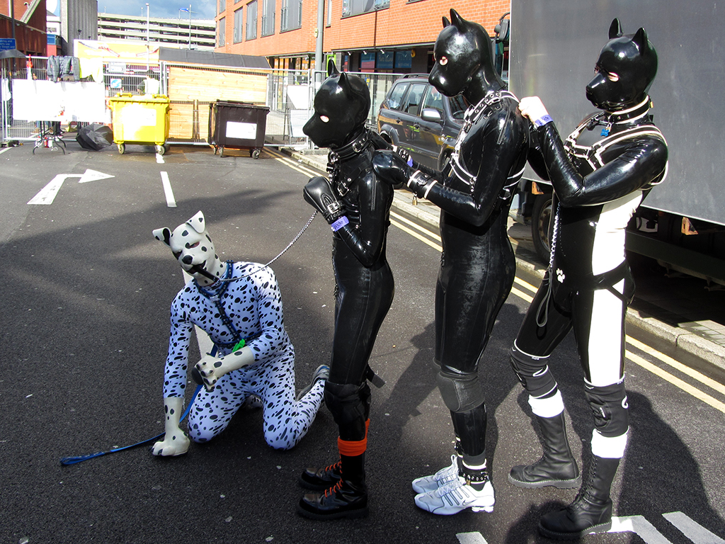 This is where the fun begun – wearing figure hugging Lycra, there wasn’t really much place for me to hide anything. The comment from the security guard was along the lines of “I need to be sure that you haven’t anything to hide”, as I’d made the comment that I had no pockets to hide anything … I let him pat me down to be sure … he then announced to his colleagues, that I had nothing on me I shouldn’t and then proceeded to point at my middle area and went on to say “… well, apart from maybe that!” … he was referring to my manhood …. while another security guard exclaimed on the fact that there was a dog in the bag as well – referring to my pup hood and paws! We all chuckled and then were allowed in to the Pride village